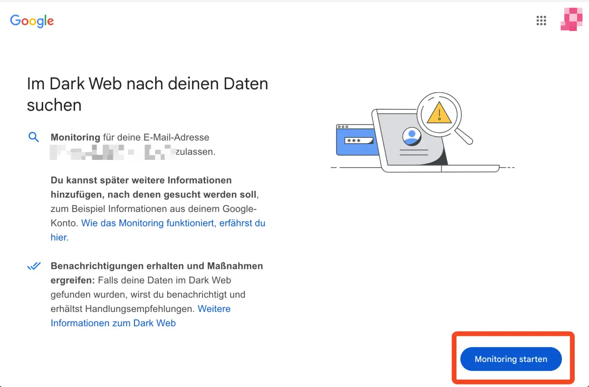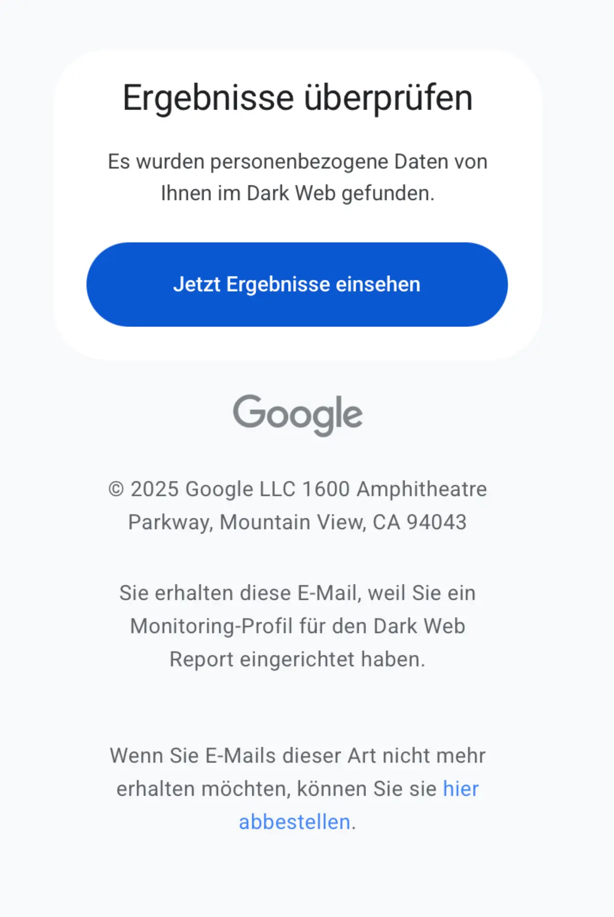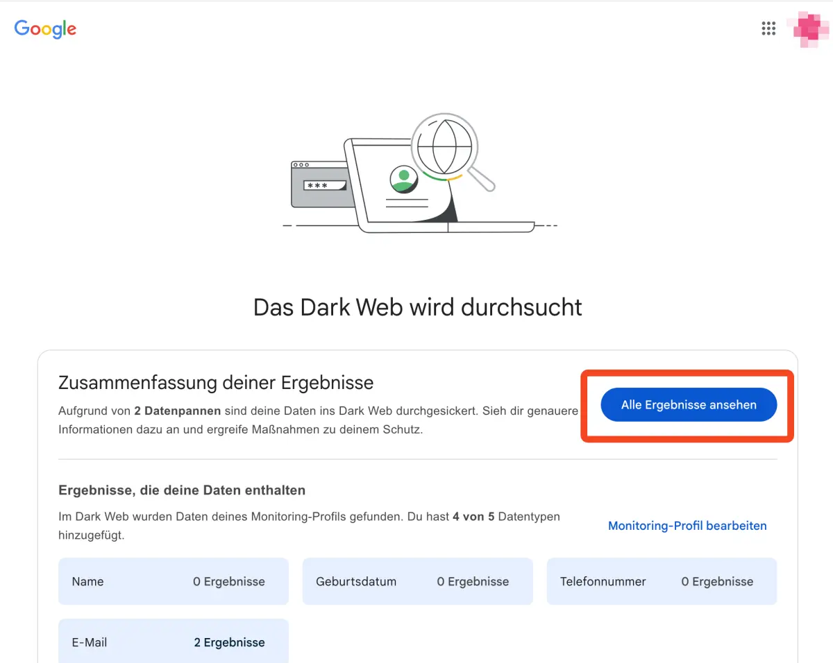 Once set up, Google will begin scanning the dark web for your data and will notify you via email if any of your information is found in a data breach.