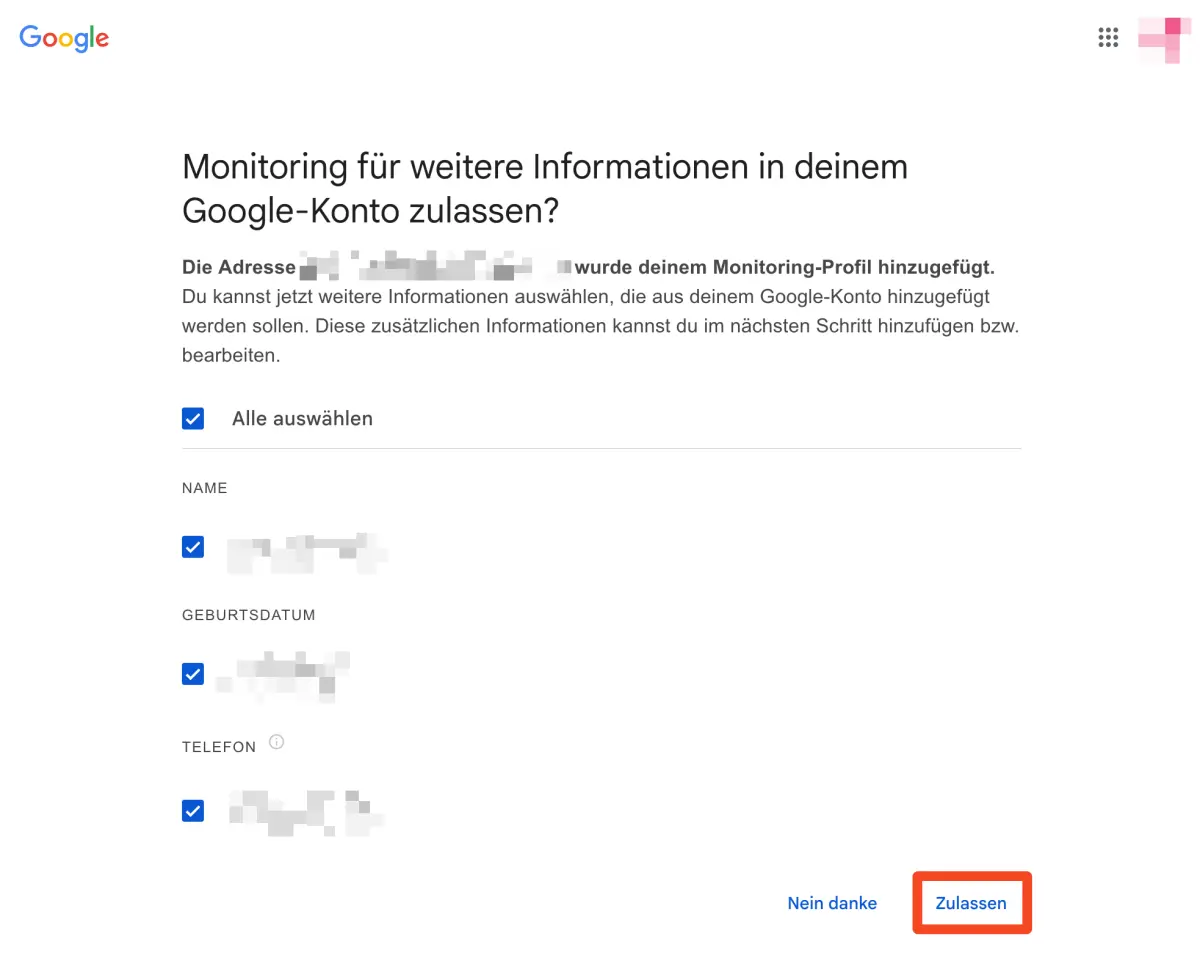 Select your details Google will then ask you to confirm the information you want it to scan for. Select all available fields. This typically includes your name and the email address associated with your Google Account.